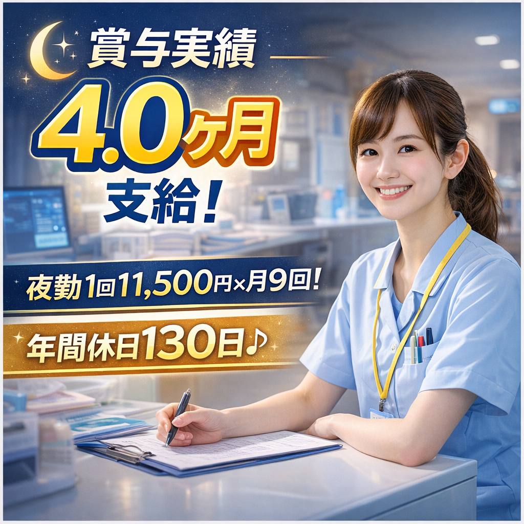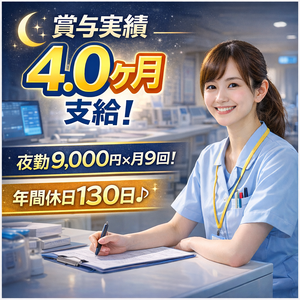 給与月給 341,000円~451,300円交通勤務時間17:00~翌9:30(休憩90分) ★入職後、一定期間は日勤での業務を行っていただきます。(業務や患者様の状態とを理解する為) 残業:あり(月平均1時間)・夜間の病棟業務(患者ケア、状態確認)