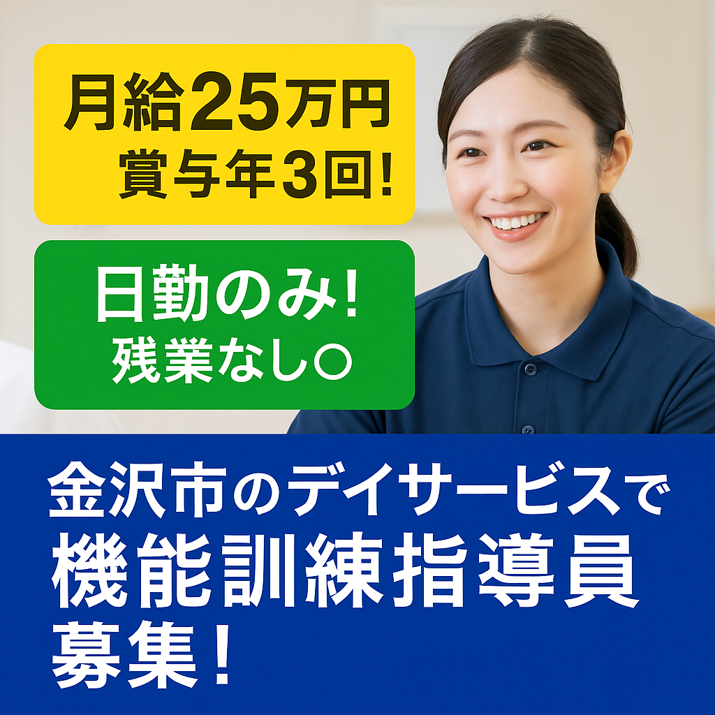 給与月給 213,150円~250,650円交通西金沢駅より徒歩5分勤務時間【就業時間】08:30〜17:30(休憩60分) ・変形労働時間制(1ヶ月単位) ・時間外労働:なし\ デイサービスでのリハビリ支援業務 /