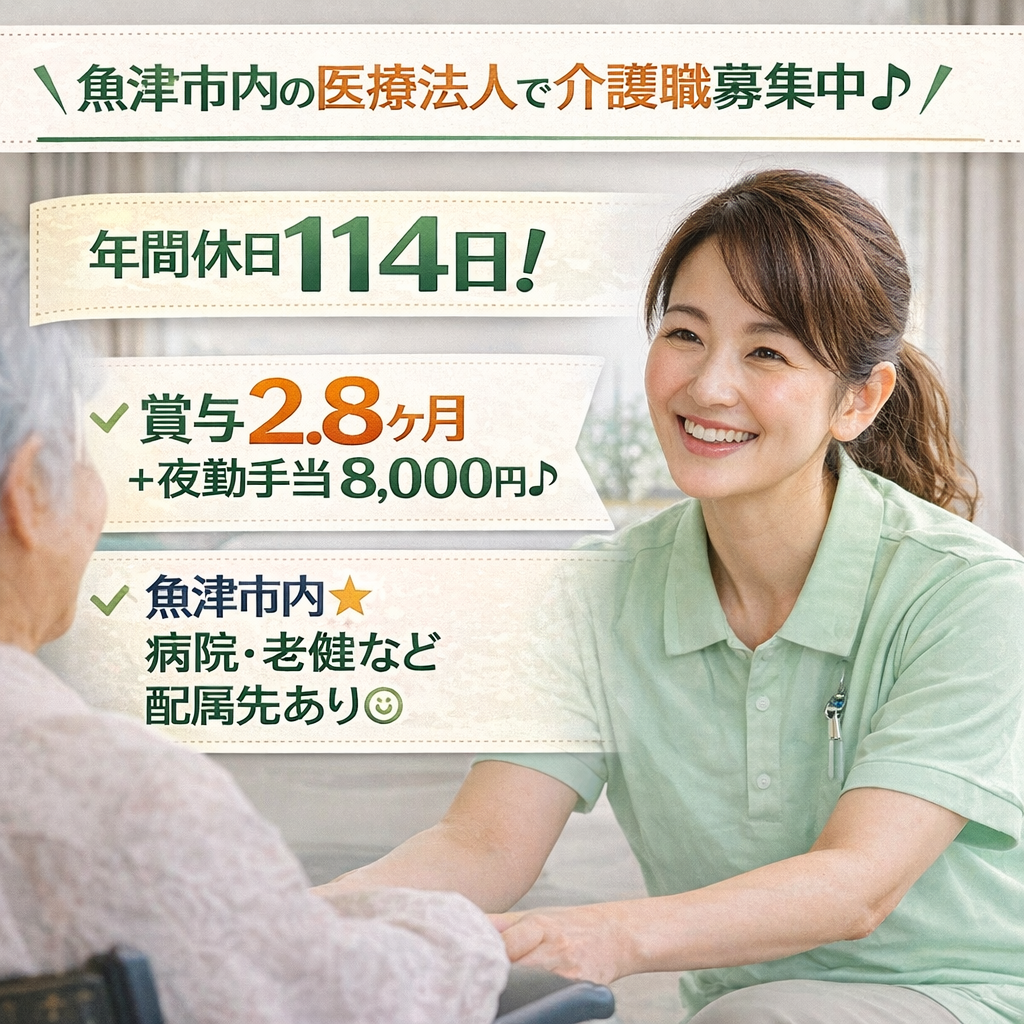 給与月給 180,798円~191,286円交通最寄駅:富山地方鉄道「電鉄魚津駅」より徒歩10分勤務時間【シフト制(変形労働時間制・1ヶ月単位)】 (1)07:15~16:15 (2)07:30~16:30 (3)08:30~17:30 (4)10:00~19:00 (5)16:00~翌09:00(夜勤) ・休憩60分/残業なし ・夜勤月4回程度(応相談)\ “やさしい介護”で患者さん・入居者様を支えるお仕事! /